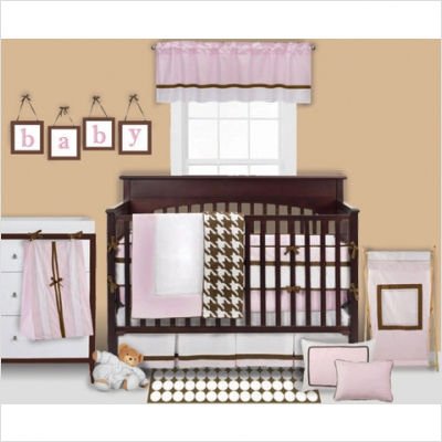 [***INCLUDED IN THIS SET: (1)Metro 4 Piece Crib Bedding Set in Pink / White / Chocolate] Features: -Throw is frame style comforter.-Bumper guard with yarn dyed ties.-Pink and white vertical rugby stripes with chocolate stitching on one side and solid pink on the other side.-Crib sheet is super soft, 200 thread count.-Valance in pink with a white and a chocolate band at the bottom.-Diaper stacker is featuring pink and white vertical rugby stripes with chocolate stitching.-Soft plush velour blanket in pink on one side and white on the other side.-Rounded corners and chocolate chording on the edge.-Quilted, rectangular throw features pink fabric on one side and white fabric on the other side.-Frame style quilted boudoir pillow has a pink and chocolate edge and white center.-Curtain panel houndstooth is a classic pattern.-Contemporary style.-Cotton shell with polyester fill.-Machine washable. Includes: -Set includes optional 4 piece crib set, valance, diaper stacker, fitted sheet, blanket, play mat, decorative pillows, boudoir, moses basket, hamper, panel and changing pad cover.-4-piece crib bedding set includes: throw, bumper guard, crib skirt and crib sheet. Options: -Extra crib sheets available in white, pink, khaki, lime, and houndstooth printed fabric. Color/Finish: -Hamper is accented with pink and white fabrics and chocolate stitching. Dimensions: -Crib skirt tailored with 14'' drop and inverted box pleats.